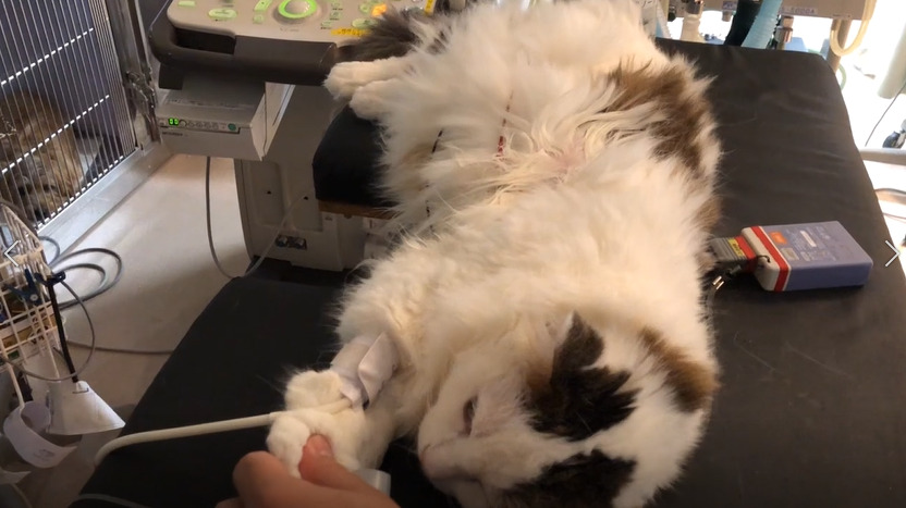 雑種猫、8歳5カ月齢、去勢雄、体重4.68kg。心疾患の管理中であったが、3日ほど投薬できておらず、かかりつけ医より紹介来院した。肺水腫によりB-lineの増加(white lung)が認められた。